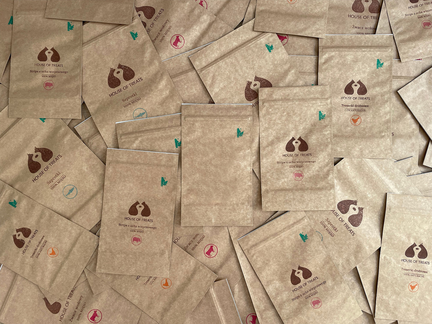 Szybko zdaliśmy sobie sprawę się jak bardzo musimy uważać zamawiając smaczki dla naszego psiego przyjaciela. W wielu z nich oprócz mięsa znajdują się chemiczne ulepszacze, konserwanty i barwniki. Co więcej, w naszym koszu pojawiało się mnóstwo plastikowych opakowań.